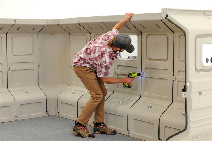 There are threaded inserts on the interior wall of each cabin panel, making it a snap to install furnishings. When not in use, the panels nest together for compact storage or shipping.
